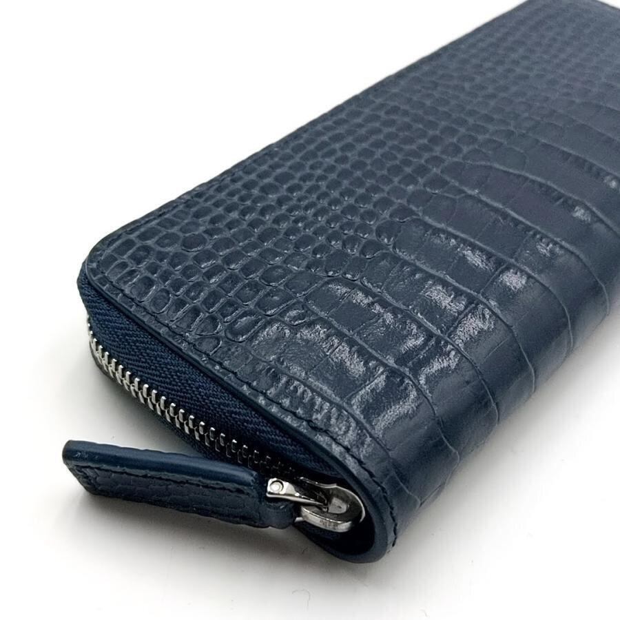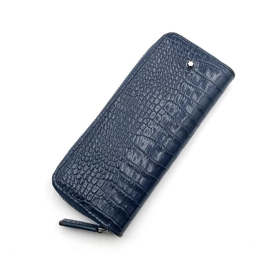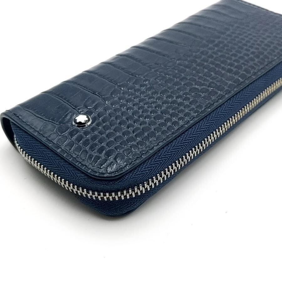 ・送料無料 美品 モンブラン MONT BLANC ペンポーチ ペンケース マイスターシュテュック セレクション 2本用 ラウンドファスナー ラウンドジップ レザー クロコ型押し ブルーネイビー系