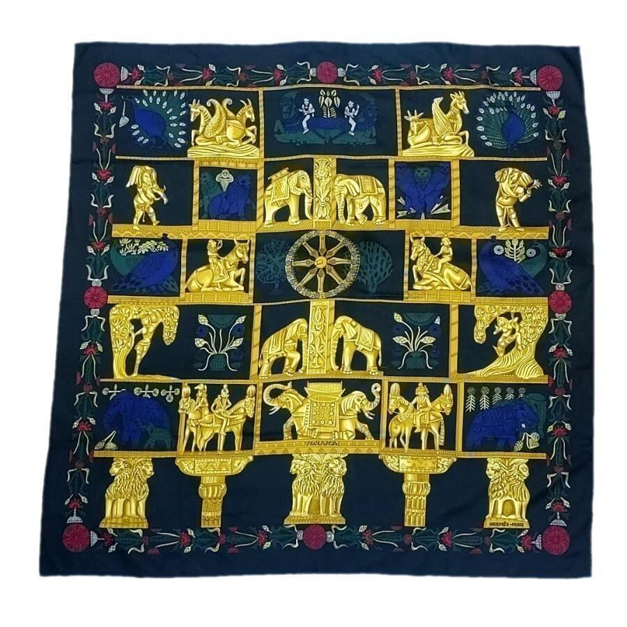 ・送料無料 美品 エルメス HERMES 大判スカーフ カレ90 TORANA 塔門 絹 シルク100% 仏製 フランス製 紺 ネイビー系 レディース