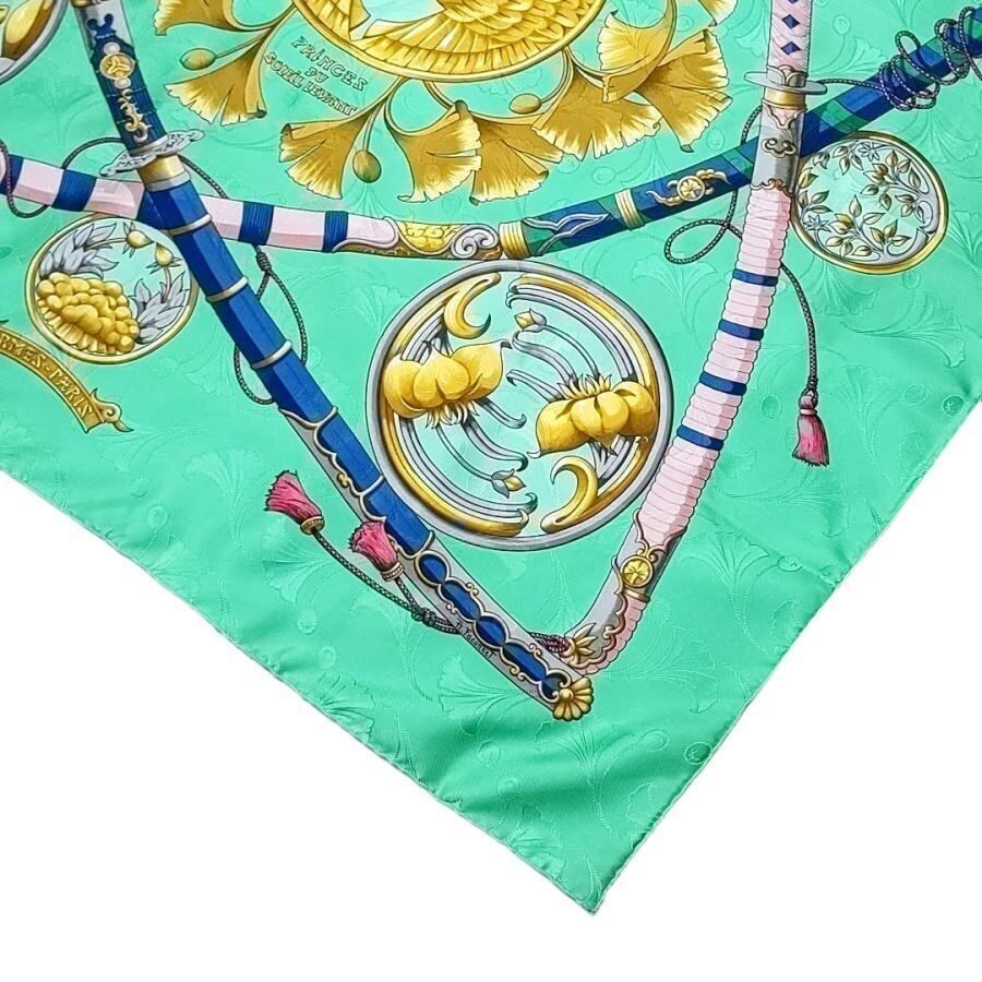 ・送料無料 超美品 エルメス HERMES スカーフ カレ90 大判 ショール DAIMYO PRINCES DU SOLEIL LEVANT 大名 日出る国の皇子 家紋 絹 シルク100% 仏製 フランス製 緑 グリーン系 レディース