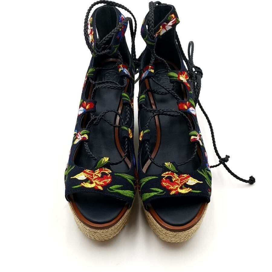 ・送料無料 超美品 トリーバーチ TORY BURCH サンダル 靴 シューズ エスパドリーユ ウェッジソール 厚底 フラワー 花柄 5595 L17 S/N45510 8.5M 25.5cm相当 黒 ブラック系 レディース