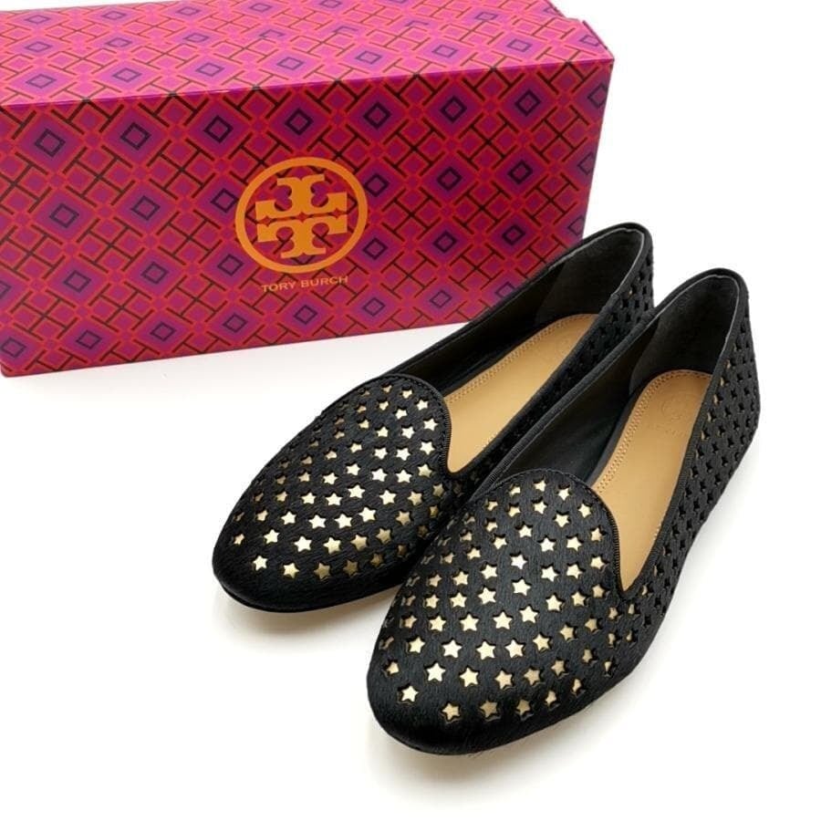 ・送料無料 超美品 トリーバーチ TORYBURCH スリッポン パンプス 靴 シューズ 52443 OLYMPIA STAR LOAFER ハラコ 星 スター フラットシューズ 6.5 23.5cm相当 黒 ブラック系 レディース