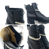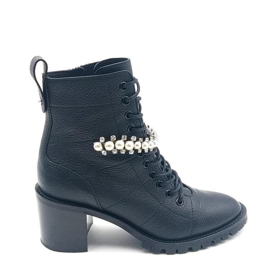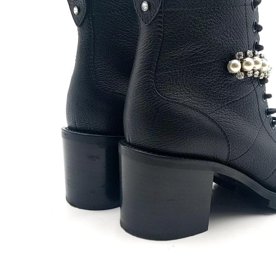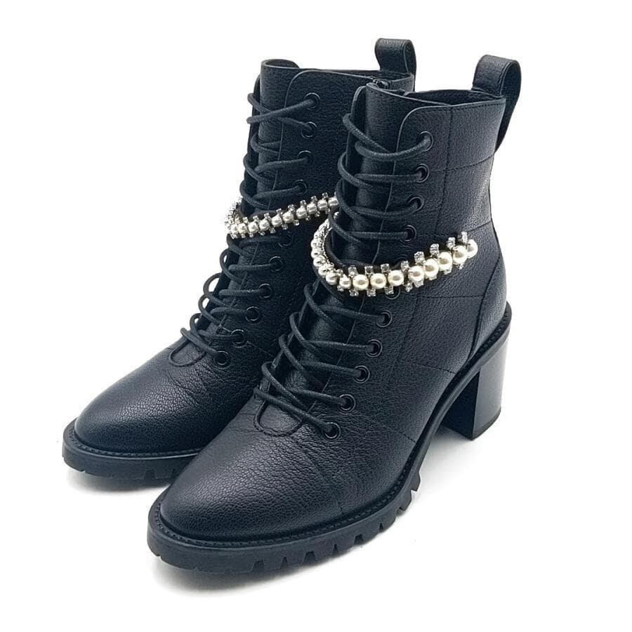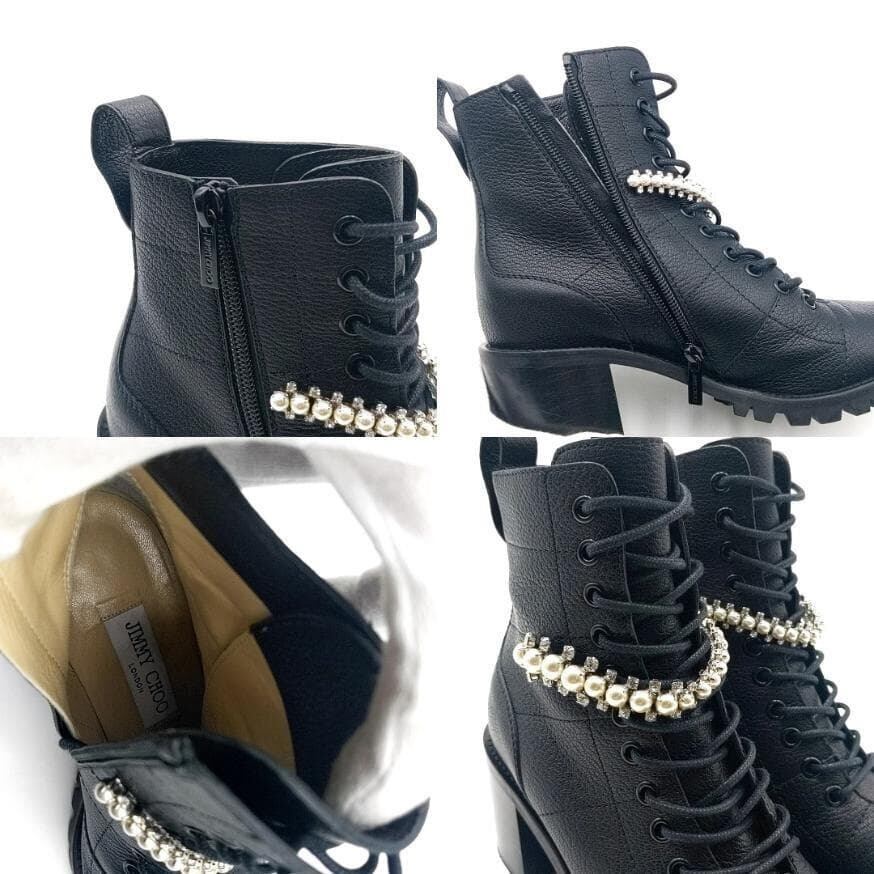 ・送料無料 美品 ジミーチュウ JIMMY CHOO ショートブーツ CRUZ65ブーツ 靴 シューズ ビジュー パール レースアップ レザー 本革 サイドジップ 伊製 イタリア製 37 1/2 24.5cm相当 黒 ブラック系 レディース