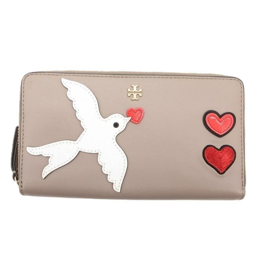 ・送料無料 トリーバーチ TORY BURCH 長財布 財布 ラウンドファスナー ラウンドジップ ロングウォレット PEACE & LOVE ピース&ラブ コレクション ハート 鳥モチーフ レザー 本革 グレージュ系 レディース