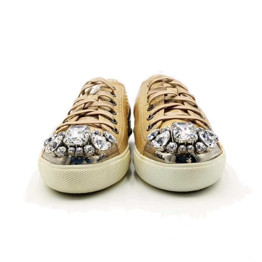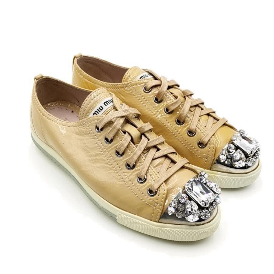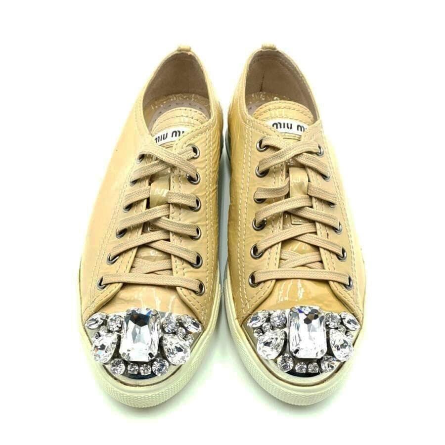 ・送料無料 ミュウミュウ MIUMIU スニーカー 靴 シューズ 5E-8557 エナメル パテントレザー ビジュー レースアップ 35 22cmcm相当 イエローベージュ系 レディース
